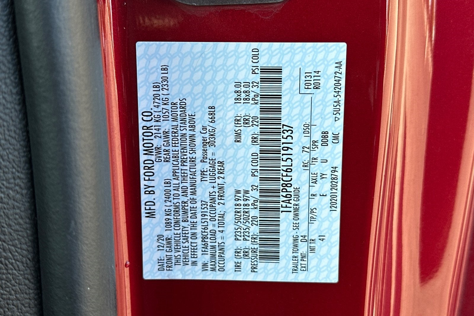 This 2020 Rapid Red Metallic Tinted Clearcoat Ford Mustang GT Premium RWD is well equipped and includes these features and benefits: Enhanced Security Package (Active Anti-Theft System and Wheel Locking Kit), Equipment Group 400A, Mustang GT Premium, 5.0L V8 Ti-VCT, RWD, Wheels: 18 x 8 Machined-Face Aluminum, 4-Wheel Disc Brakes, 9 Speakers, ABS brakes, Air Conditioning, Alloy wheels, AM/FM radio: SiriusXM, AM/FM Stereo, Auto-dimming Rear-View mirror, Automatic temperature control, Brake assist, Bumpers: body-color, Climate Controlled Heated/Cooled Front Seats, Compass, Delay-off headlights, Driver door bin, Driver vanity mirror, Dual front impact airbags, Dual front side impact airbags, Electronic Stability Control, Emergency communication system: 911 Assist, Exterior Parking Camera Rear, Four wheel independent suspension, Front anti-roll bar, Front Bucket Seats, Front Center Armrest, Front dual zone A/C, Front fog lights, Front reading lights, Fully automatic headlights, Garage door transmitter, Heated door mirrors, Heated front seats, Illuminated entry, Knee airbag, Leather Bucket Seats, Leather Shift Knob, Low tire pressure warning, Occupant sensing airbag, Outside temperature display, Overhead airbag, Overhead console, Panic alarm, Passenger door bin, Passenger vanity mirror, Power door mirrors, Power driver seat, Power passenger seat, Power steering, Power windows, Radio data system, Rear anti-roll bar, Rear window defroster, Remote keyless entry, Security system, SiriusXM Radio, Speed control, Speed-sensing steering, Speed-Sensitive Wipers, Split folding rear seat, Spoiler, Steering wheel mounted audio controls, SYNC 3 Communications & Entertainment System, Tachometer, Telescoping steering wheel, Tilt steering wheel, Traction control, Trip computer, Turn signal indicator mirrors, Variably intermittent wipers, Ventilated front seats, Voice-Activated Touch-Screen Navigation System, and Voltmeter. Mustang GT Premium, 5.0L V8 Ti-VCT, RWD, Active Anti-Theft System, Enhanced Security Package, Equipment Group 400A, Wheel Locking Kit, Wheels: 18 x 8 Machined-Face Aluminum.