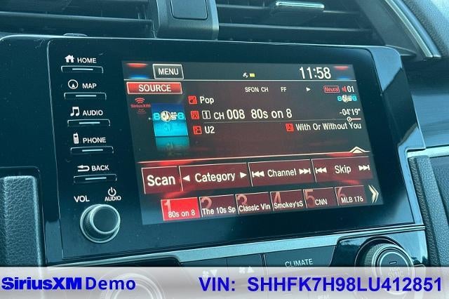 Sonic Gray Pearl 2020 Honda Civic Sport Touring FWD CVT 1.5L I4 DOHC 16V NON-SMOKER, Leather Seats, Backup Camera, Bluetooth®, Moonroof, Alloy Wheels, Aluminum Wheels, Heat Package, Light Package, Power Mirror Package, Power Package, Sunroof/Moonroof, Civic Sport Touring, 4D Hatchback, 1.5L I4 DOHC 16V, CVT, FWD, Sonic Gray Pearl, Black w/Leather Seat Trim, 12 Speakers, 18 Alloy Wheels, 4-Wheel Disc Brakes, ABS brakes, Adaptive Cruise Control: Adaptive Cruise Control (ACC) with Low-Speed Follow, Air Conditioning, Alloy wheels, AM/FM radio: SiriusXM, Apple CarPlay/Android Auto, Auto High-beam Headlights, Auto-dimming Rear-View mirror, Automatic temperature control, Brake assist, Bumpers: body-color, Compass, Delay-off headlights, Driver door bin, Driver vanity mirror, Dual front impact airbags, Dual front side impact airbags, Electronic Stability Control, Emergency communication system: HondaLink, Exterior Parking Camera Rear, Forward collision: Collision Mitigation Braking System (CMBS) + FCW mitigation, Four wheel independent suspension, Front Bucket Seats, Front Center Armrest, Front dual zone A/C, Front fog lights, Front reading lights, Fully automatic headlights, Garage door transmitter: HomeLink, Heated door mirrors, Heated front seats, Heated rear seats, Illuminated entry, Lane departure: Lane Keeping Assist System (LKAS) active, Leather Shift Knob, Leather-Trimmed Seating Surfaces, Low tire pressure warning, Navigation System, Occupant sensing airbag, Outside temperature display, Overhead airbag, Overhead console, Panic alarm, Passenger door bin, Passenger vanity mirror, Power door mirrors, Power driver seat, Power moonroof, Power passenger seat, Power steering, Power windows, Radio data system, Radio: 540-Watt HD Premium Audio w/Navigation, Rain sensing wipers, Rear seat center armrest, Rear window defroster, Rear window wiper, Reclining Heated Front Bucket Seats, Remote keyless entry, Security system, Speed control, Speed-sensing steering, Speed-Sensitive Wipers, Split folding rear seat, Spoiler, Steering wheel mounted audio controls, Tachometer, Telescoping steering wheel, Tilt steering wheel, Traction control, Trip computer, Turn signal indicator mirrors, Variably intermittent wipers.
