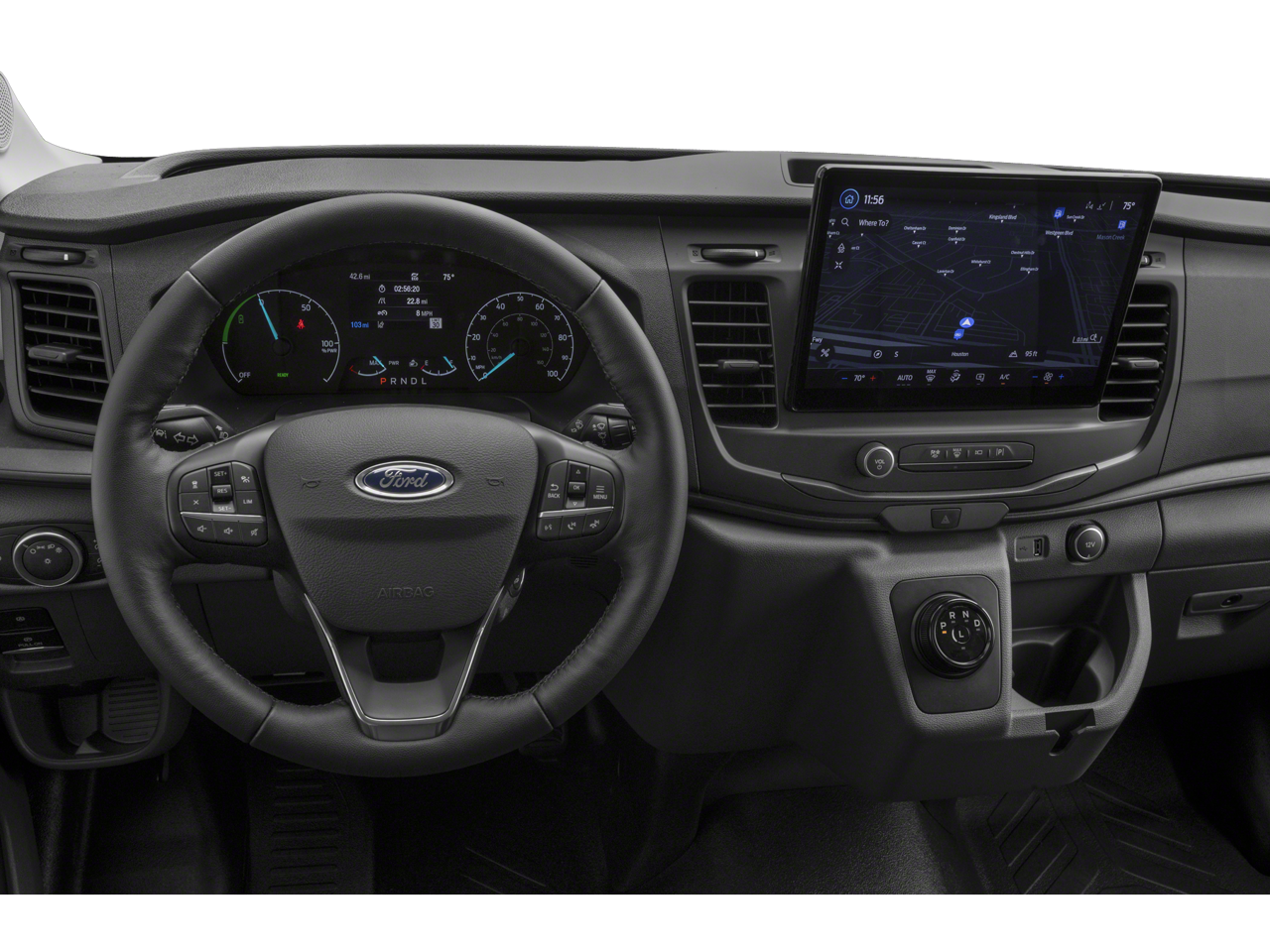 - Radio: AM/FM Stereo w/SYNC 4 -inc: 12" multi-function display, Bluetooth®, dual USB ports, embedded voice recognition, connected navigation w/3 years of service available through Ford Pro Intelligence, 4 speakers (front), Ford commercial solutions energy management and vehicle insight tools (access to the Ford charge network, public charging account setup and management, driver public charging tools, home charging reimbursement, Ford E-Telematics dashboard and connected navigation) included for commercial and business customers complimentary for 1 year